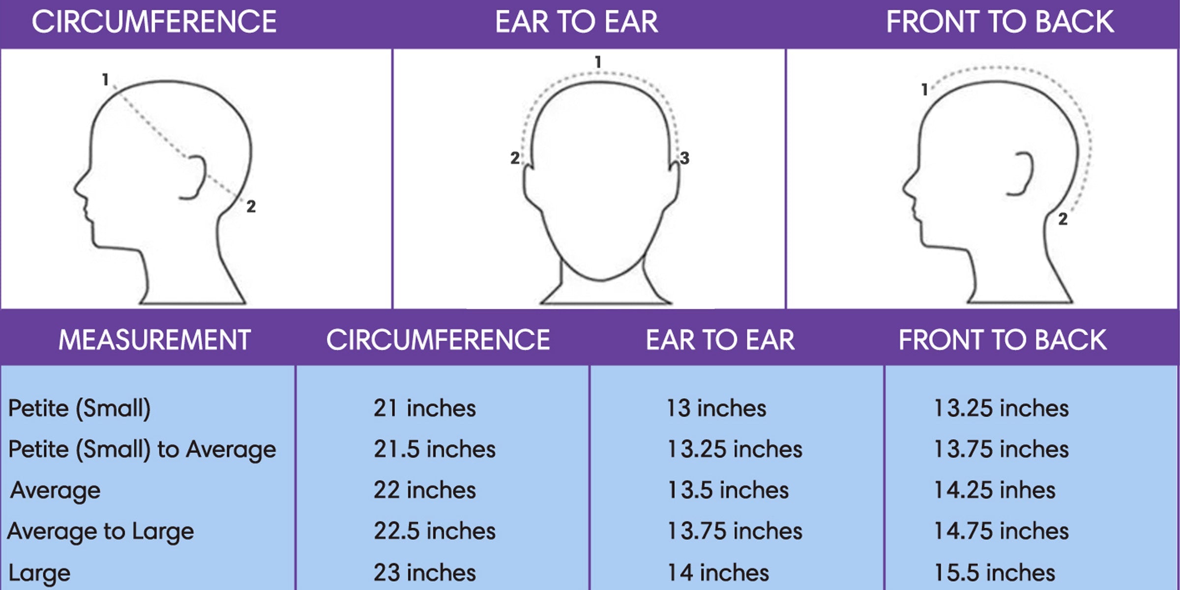 Before you get to measuring, let’s review the standard wig sizes that you’ll generally find at wig shops. The first is the average size range. About 90% of wig wearers will fit in this size group, which ranges from 21.25 to 22.5 inches in diameter. Because this wig size is so popular, you are likely to find many different types of wigs that are average sized.