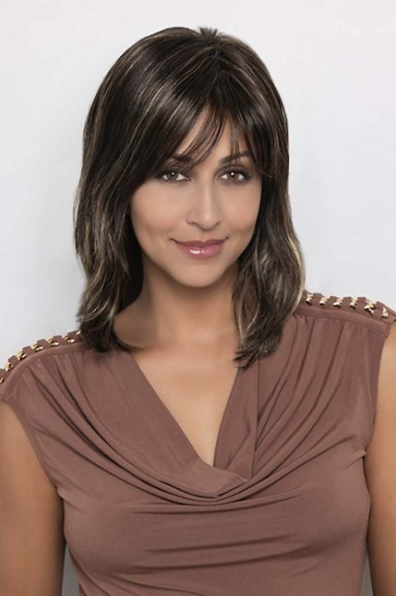 Attractive mid-length style with side-swept bangs, long layers, and 100% capless construction.